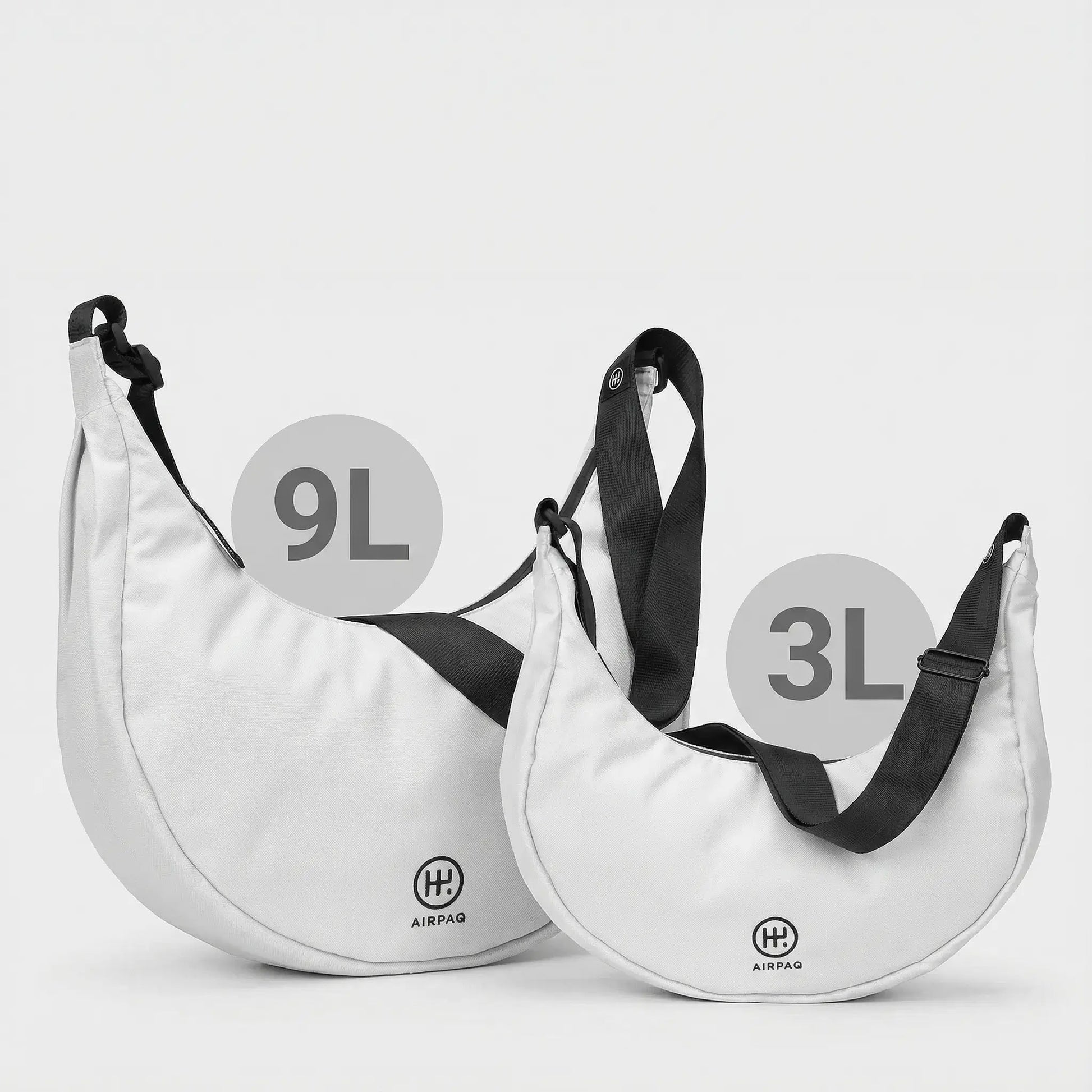 9L Halbmondtasche aus Airbags – genug Platz für alles, was dir unterwegs wichtig ist.