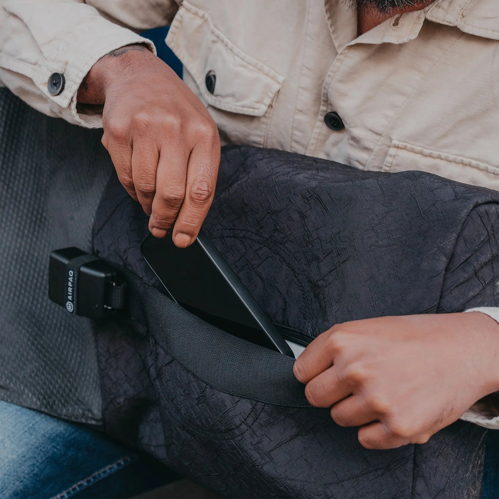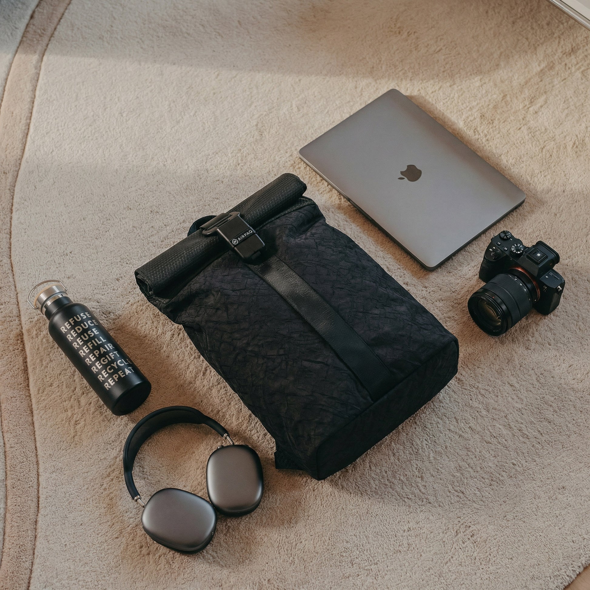 Mit gepolsterten Trägern aus Sicherheitsgurten und cleveren Fächern bietet der Airpaq-Rucksack maximalen Tragekomfort und eine durchdachte Organisation. Ob du zur Arbeit pendelst oder auf Reisen bist – du bist bestens ausgestattet und hast alles griffbereit.