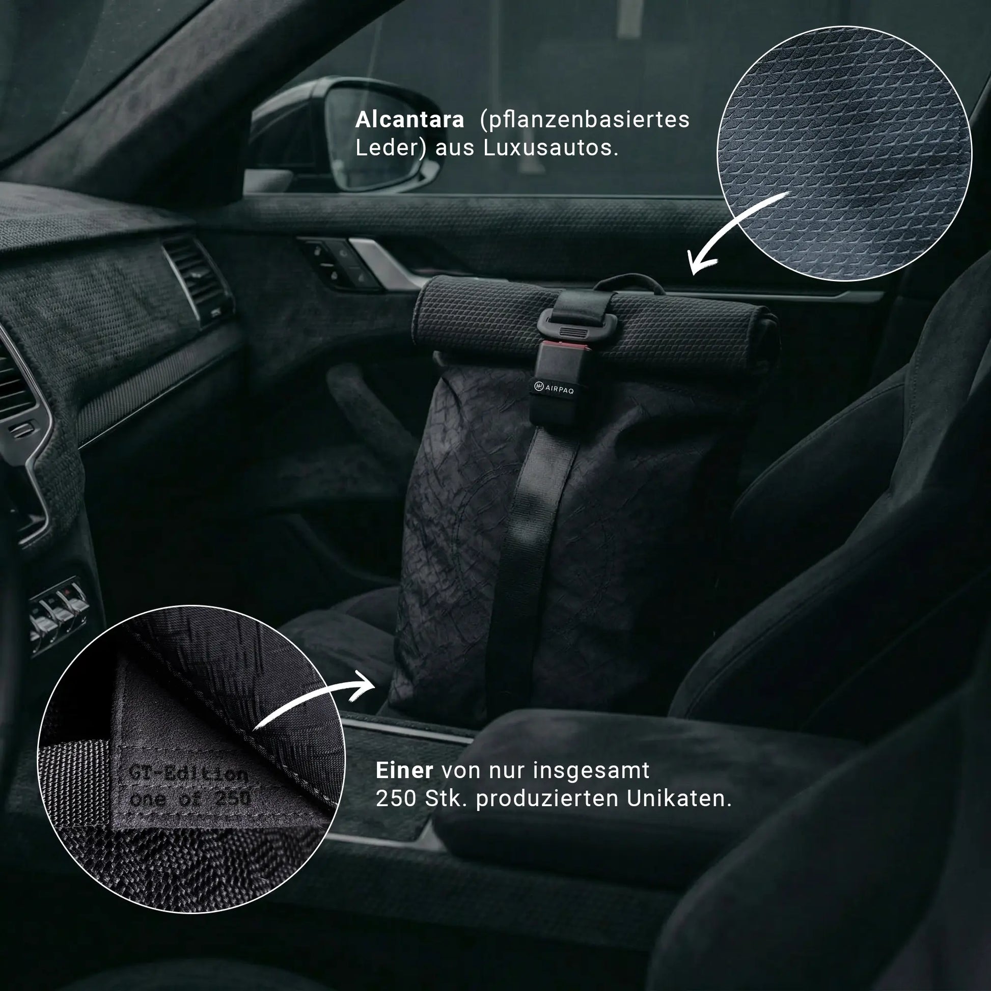 • Das Hauptmaterial besteht aus bis zu 85% upgecycelten Airbags (PA 6.6 Nylonstoff), Sitzgurten und Gurtschlössern.