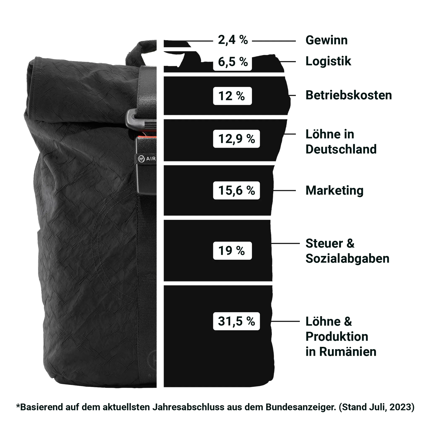 Wir möchten dir einen klaren Einblick in die Zusammensetzung unserer Produktpreise geben. Unsere Preisgestaltung basiert auf dem Jahresabschluss 2021 und spiegelt die Qualität sowie die Nachhaltigkeit unserer Produkte wider. Die beigefügte Grafik veranschaulicht, wie sich der Preis eines jeden Airpaq-Produkts zusammensetzt.