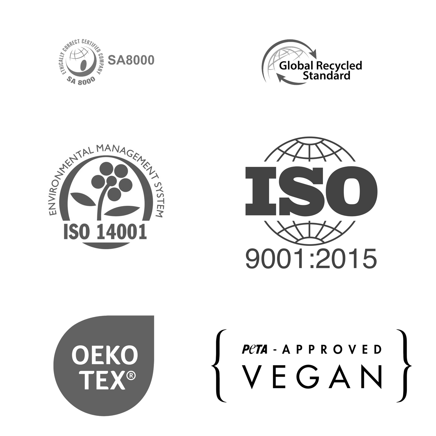 Unsere Näherei 'Cottontex' in Timișoara hat die Zertifizierungen ISO 9001, SA 8000, ISO 14001 und unterliegt dem 'Global Recycled Standard' (GRS). Unsere Färberei 'Intercolor' verwendet Oeko-Tex-zertifizierte Farben und folgt der EU-Chemikalienverordnung 'Normativa REACH'. Zudem sind wir 'PETA-Approved Vegan', da wir keine tierischen Produkte verwenden.
