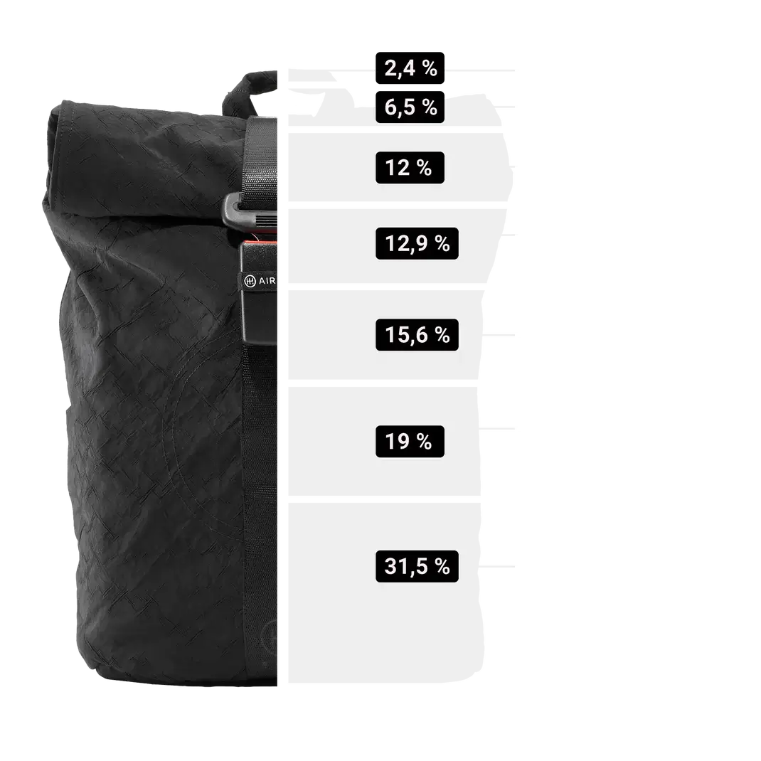 Durch die robusten Airbag-Materialien ist der Rucksack besonders strapazierfähig. Im Schnitt wiegt er etwa 200 g mehr als herkömmliche Modelle in seiner Größenklasse, bleibt aber angenehm tragbar und alltagstauglich.