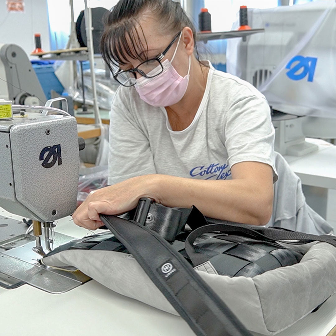 Wir beziehen überschüssige Materialien wie Airbags und Autogurte direkt aus der Sicherheitsindustrie, bevor sie recycelt oder verbrannt würden. Statt diese Materialien energieintensiv aufzubereiten, verwenden wir sie in ihrer bestehenden Form weiter. Das ist die Königsklasse der Nachhaltigkeit, denn Upcycling schont Ressourcen oft noch effektiver als Recycling